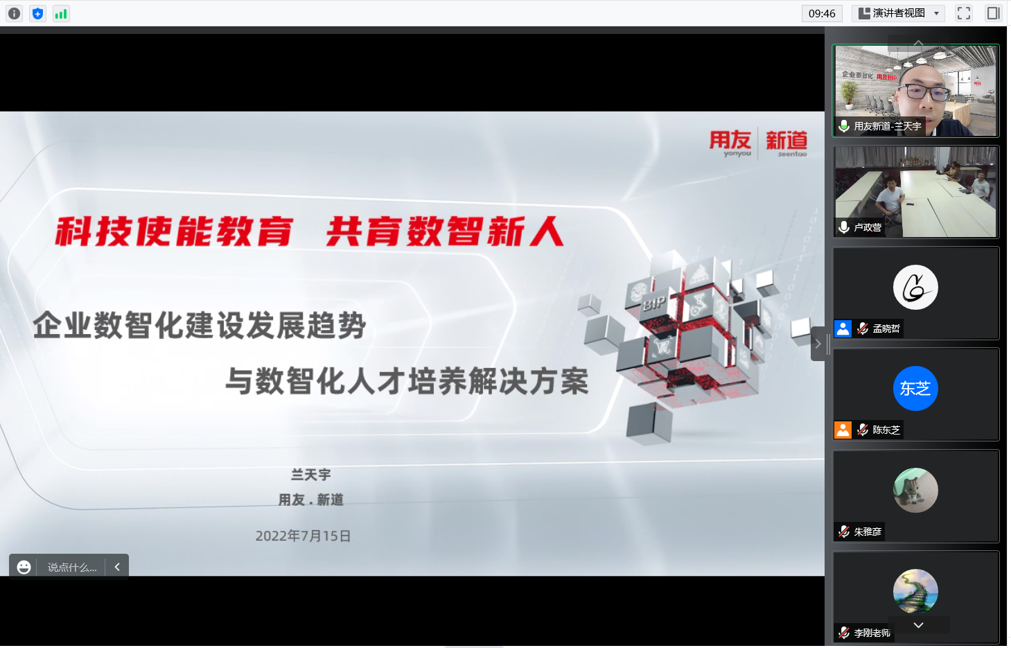 会议还邀请了用友新道的兰天宇老师进行了“企业数智化建设发展趋势与数智化人才培养解决方案”的经验交流,企业数智化是中国企业发展的新航向,同时也要求高校进行数智化人才培养。他以数字营销、数字人力等为例,介绍了数字化实践教学体系的构建,通过产教融合构建交叉学科的人才培养体系。
