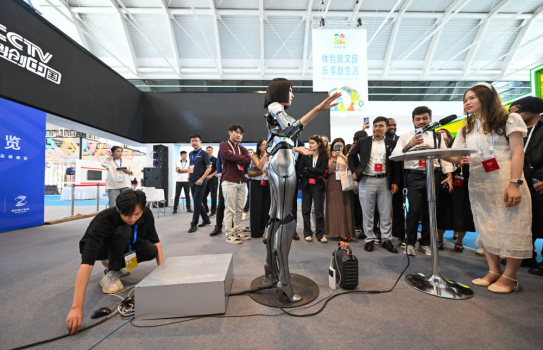 会展搭建师在天津举办的中国文化旅游产业博览会现场维护AI机器人互动设备(9月13日摄)。新华社记者 孙凡越 摄