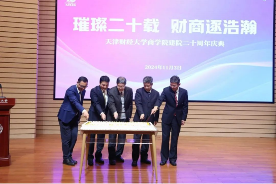 的新老院领导张英华、彭正银、刘玉斌、张建宇共同走上舞台,切下象征新征程的建院20周年庆典蛋糕,将现场的欢庆气氛推向高潮,第一阶段的庆典活动在掌声中圆满结束。
