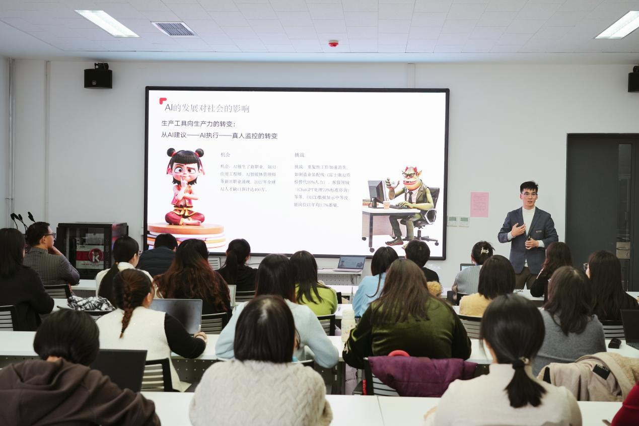 张亚飞以人工智能的定义与发展简史为切入点,勾勒出AI从“符号推理”到“深度学习”的演进脉络。从ChatGPT的爆火到大模型DeepSeek的实践应用,他指出“AI不仅是工具,更是重塑生产力的‘新基建’”。通过剖析AI在金融风控、智能投顾、数据决策等领域的渗透案例,他生动阐释了以技术驱动学科跨界融合的可能性。