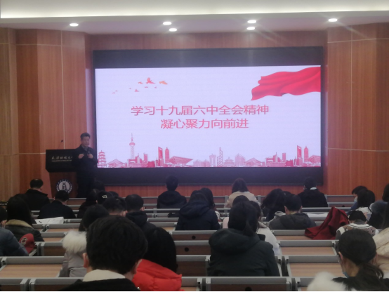 党委书记彭正银在综合楼Z001进行学习贯彻党的十九届六中全会精神宣讲,全体教工参加报告会。