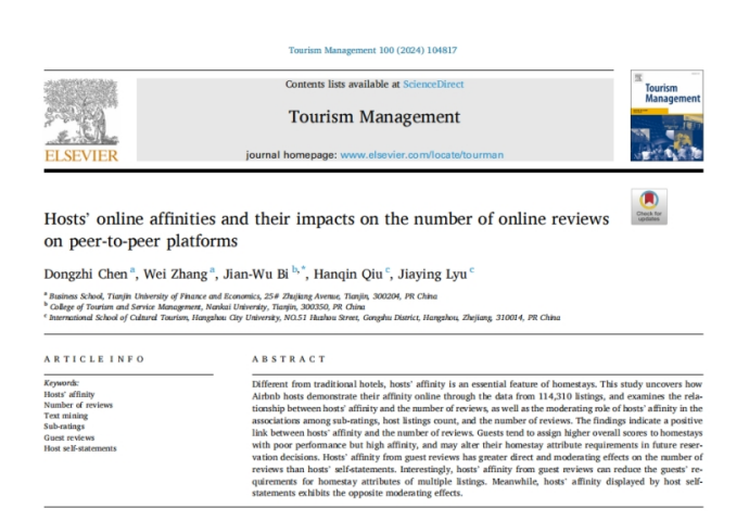 Dongzhi Chen , Wei Zhang , Jian-Wu Bi , Hanqin Qiu , Jiaying Lyu (2023). Hostsonline affinities and their impacts on the number of online reviews on peer-to-peer platforms. Tourism Management, 100 (2024) 104817.