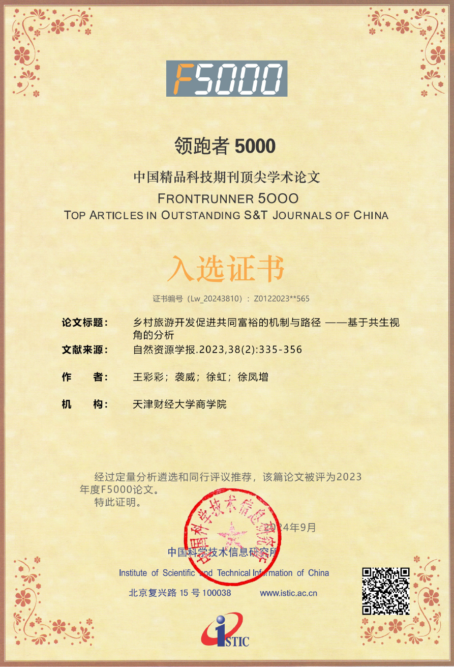 日前,科技部中国科学技术信息研究所在北京举办“2024年中国科技论文统计结果发布会暨中国一流科技论文世界影响力评价论坛”,发布了“领跑者5000——中国精品科技期刊顶尖学术论文(F5000)”。旅游系王彩彩老师以第一作者身份、无码做爱 为第一署名单位发表在《自然资源学报》期刊上的“乡村旅游开发促进共同富裕的机制与路径——基于共生视角的分析”一文被评为2023年度F5000论文。