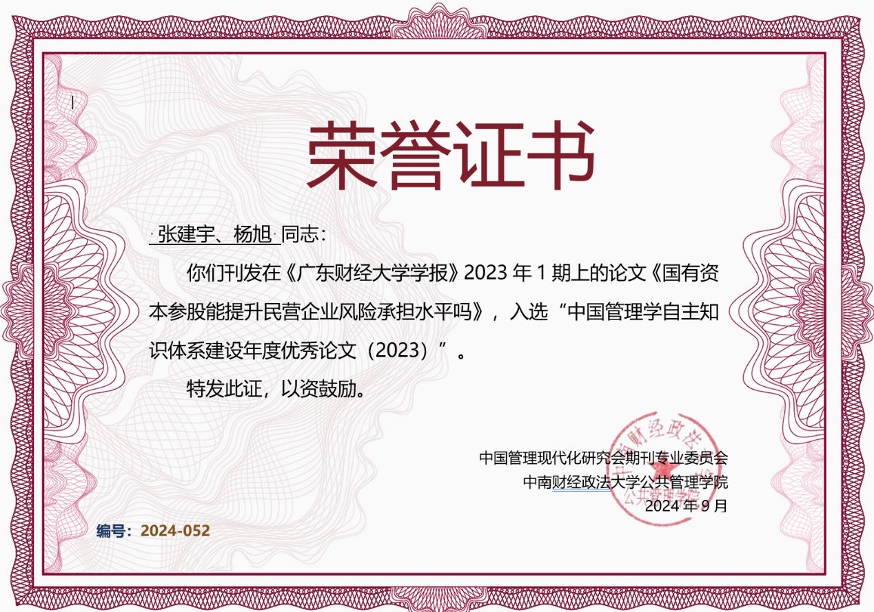 企业管理系张建宇教授及其博士生杨旭合作发表在《广东财经大学学报》2023年1期上的论文《国有资本参股能提升民营企业风险承担水平吗》荣获中国管理现代化研究会期刊工作委员会颁发的“中国管理学自主知识体系建设优秀论文(2023)”。为丰富和搭建期刊与作者之间交流互动环节,共同推动管理学自主知识体系建设,由中国管理现代化研究会期刊工作委员会主办,中南财经政法大学公共管理学院、科学研究部和社会科学院承办,中南财经政法大学学报协办的第十届中国管理学学术期刊年会上单独设置了该奖项。