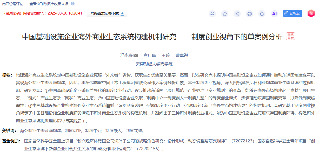 企业管理系冯永春副教授团队的论文“中国基础设施企业海外商业生态系统构建机制研究”在中文高质量期刊《南开管理评论》网络首发。