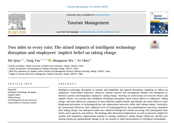 乔时副教授(第一作者)和研究团队在旅游管理国际顶级期刊Tourism Management上发表论文“Two sides to every coin:The mixed impacts of intelligent technology disruption and employees’ implicit belief on taking charge”。