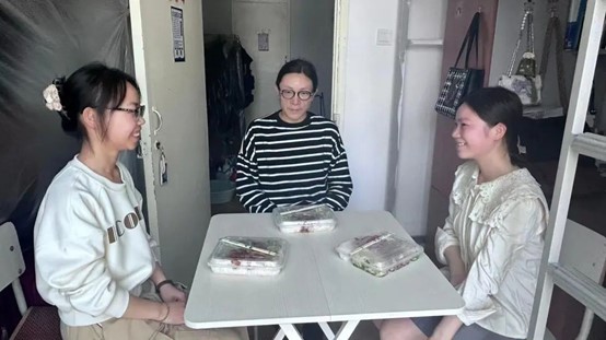第一次与老师在宿舍共进午餐,这是一次特别新奇的体验,让我能够近距离和老师沟通交流一些关于学习和生活上的问题。在用餐时,我向刘老师请教了一些关于未来发展的问题。与舍友不同的是,我计划直接就业,刘老师为我未来的职业发展提供了有针对性的建议,老师建议我在找工作之前先要考虑是否要留在家乡发展、是否从事本专业相关的工作等问题。同时,老师建议我提前寻找实习感受工作氛围,为将来的工作做好准备。除此之外,我们还讨论了许多关于学习生活和未来工作的问题,非常感谢老师给予的建议,我受益良多。